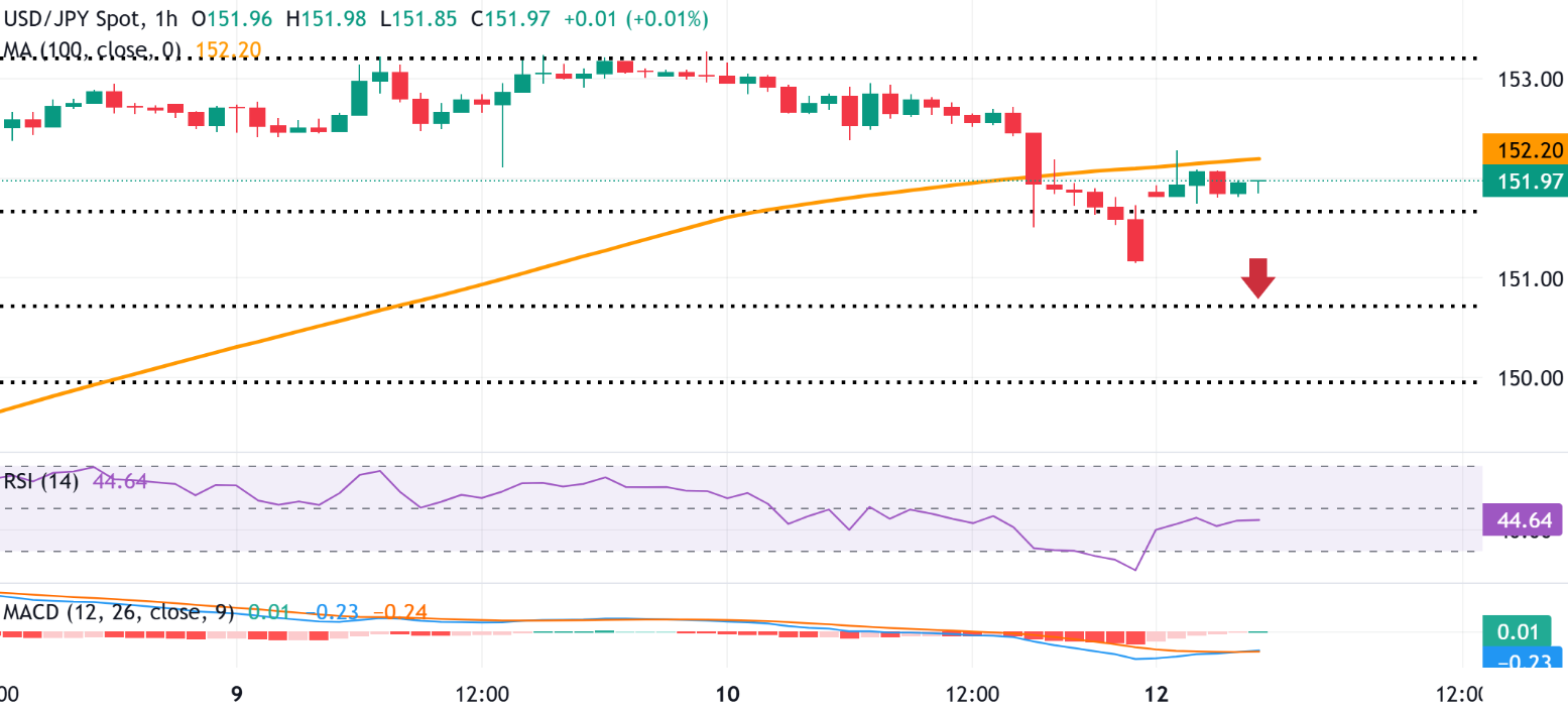 美元/日元在100小时移动平均线附近152.00下方似乎易受攻击。