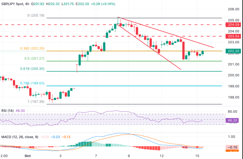 多头正在测试周二的高点202.35,目标是楔形顶部,目前位于202.80区域,预计在那里会遇到显著的阻力。在此之上,10月13日的高点203.50是确认10月8日低点以来的调整是否完成的关键水平。