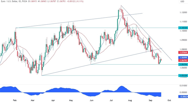 在日线图上,我们可以看到欧元兑美元在欧洲央行政策决定后遭到抛售,因为央行基本上表明他们已经完成了。该货币对在之前的波动低点1.0635处反弹,并由于价格有点超卖而回调至蓝色8移动平均线。欧元兑美元处于明显的下降趋势,因为价格不断创下更低的低点和更低的高点,并且移动平均线向下交叉。对于卖家来说,这次反弹可能只是以更好的价格出售的好机会。一个这样的良好水平可能是下降趋势线和红色 21 移动平均线在 1.0750 水平附近的汇合。