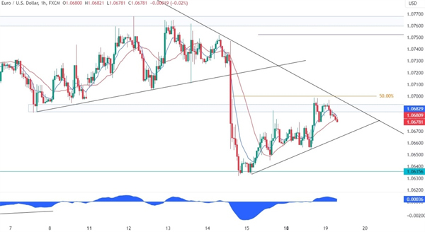 在1小时图上,我们可以看到,回调至阻力位可能会转变为看跌旗 形形态。事实上,如果价格跌破反趋势线,我们应该会看到更多卖家涌入并增加看跌势头,最终导致跌破1.0635摆动低点。卖家的目标仍然是1.05。另一方面,买家可能会在每次上行突破时大量买入,但他们需要价格突破主要趋势线和 1.08 关口才能改变整体趋势。