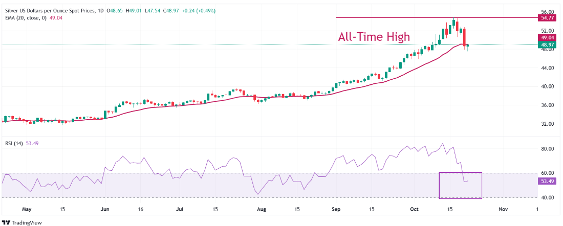 银价已从周五创下的历史新高约54.50美元进行了显著调整。由于白金属难以重返20日指数移动平均线(EMA)上方,该移动平均线目前约为49.04美元,其短期趋势已变得不确定。