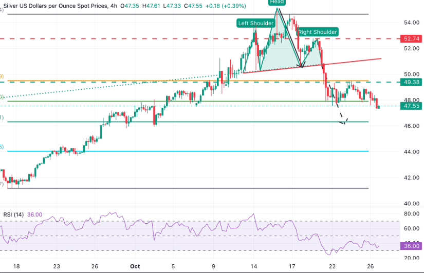 白银/美元处于一个看跌的头肩顶形态中,其目标位在46.00美元附近。