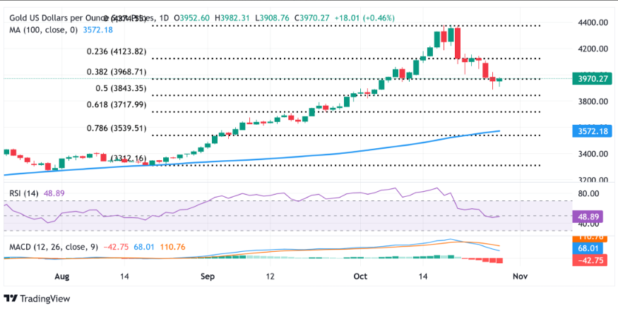 隔夜收盘价若跌破8月至10月涨势的38.2%斐波那契回撤位,可能被视为XAU/USD空头的新触发点。此外,日线图上的震荡指标也开始走弱,进一步印证了过去一周左右的回调行情可能延续。尽管如此,若金价能够持续反弹至4000美元心理关口上方,则可能引发空头回补行情,并推动金价上涨至4058-4060美元的中期阻力位,最终目标是4100美元整数关口。