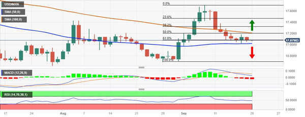 周三亚洲时段,美元/墨西哥比索仍处于守势,目前位于 17.0760-17.0755 区域附近,代表自 8 月月度波动低点反弹的 61.8% 斐波那契回撤位。然而,现货价格设法守住周一触及的两周低点和 50 日简单移动平均线 (SMA) 上方,该平均线位于 17.0235 区域附近,这应该成为备受期待的 FOMC 会议之前的一个关键点。