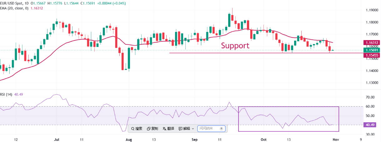 欧元/美元在两周低点附近1.1570附近努力获得进展。
