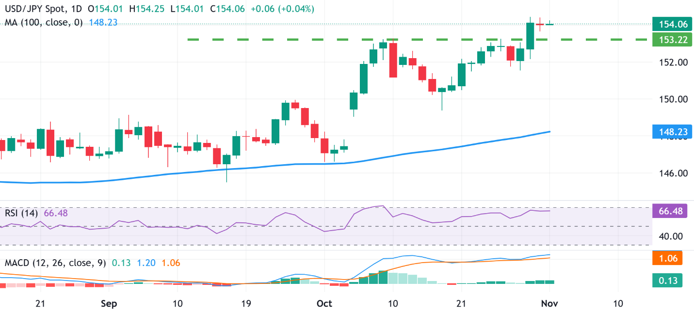 与此同时,交易员在美联储主席杰罗姆·鲍威尔上周三发表鹰派言论后,减少了对12月再次降息的押注。这帮助美元在接近三个月高点附近保持稳定,并进一步为美元/日元这对货币提供支持。
