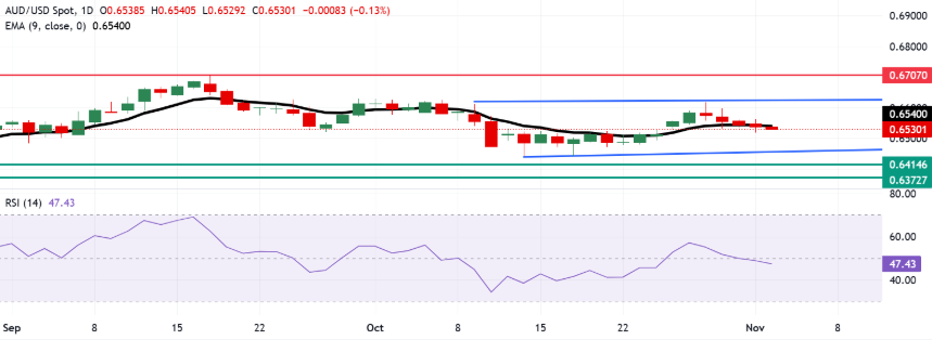周二,澳元兑美元汇率在0.6530附近交易。日线图的技术分析表明,该货币对处于整理阶段,在矩形形态内横向交易。最近突破九日指数移动平均线(EMA)表明短期价格动量减弱。