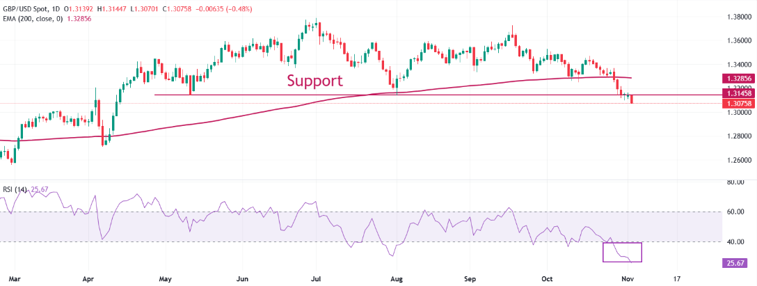 英镑在周二的欧洲时段兑美元下跌至1.3100下方。 美元兑加元的前景依然看跌,因为该货币对在200日指数移动平均线(EMA)附近1.3279下方交易。