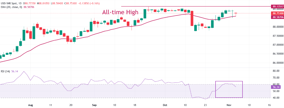 周三,美元/印度卢比跌至接近88.60。该货币对继续在20日指数移动平均线(EMA)附近找到支撑,该平均线目前交易于88.58附近。