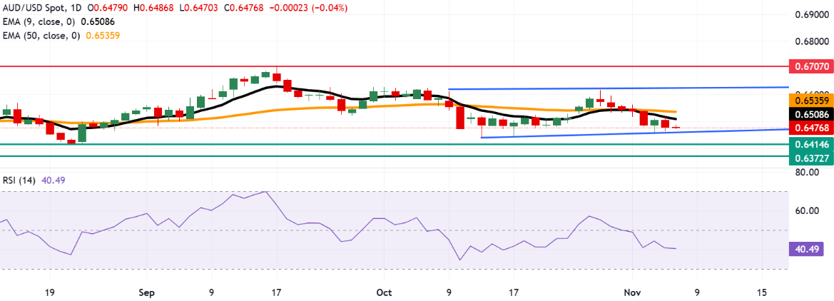 周五,澳元兑美元交易价格约为0.6470。日线图的技术分析显示,该货币对在矩形形态内整理,呈现横向交易。它仍然低于九日指数移动平均线(EMA),表明短期动量较弱。