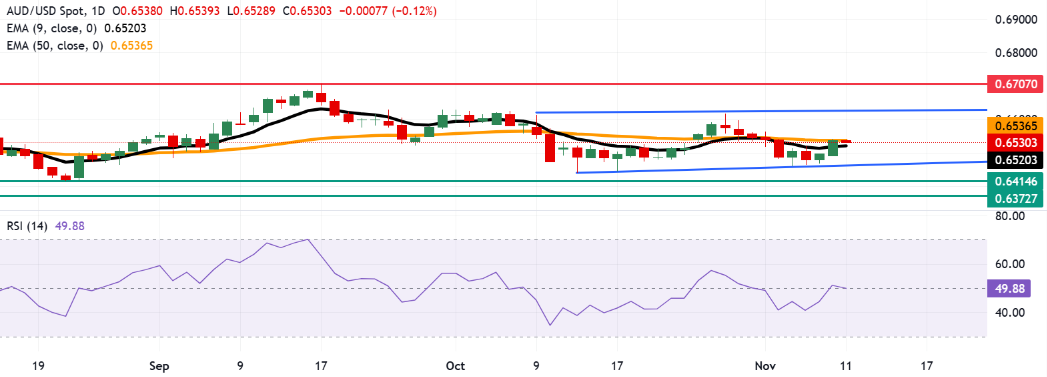 澳元兑美元对在周二于0.6530附近交易。日线图的技术分析显示,该货币对在矩形形态内整理,呈横盘交易。然而,该货币对仍高于九日指数移动平均线(EMA),表明短期动量强劲。