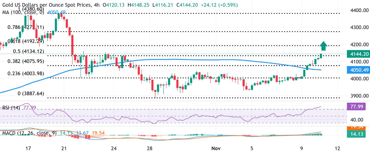 黄金(XAU/USD)从4150美元的供应区附近稍微撤退,或是在周二亚洲时段触及的近三周高点,因为支持美国政府重新开放的积极因素削弱了避险需求。然而,作为一种避险商品,黄金可能会继续从对史上最长时间的美国政府关门可能造成的经济影响的担忧中获得支持。这,再加上对美国联邦储备系统(Fed)在12月再次降息的预期,可能为无收益的黄色金属提供支持。