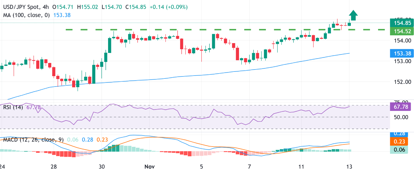 美元/日元多头占据优势,上方阻力位在154.45-154.50之间。