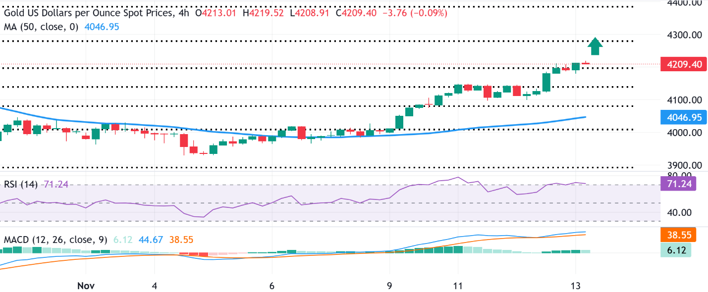 与此同时,美国联邦政府重新开放的积极发展所带来的乐观情绪,继续支持全球金融市场上的看涨情绪。这可能会阻止交易者在避险黄金周围下注新的看涨押注。也就是说,$4,200 以上的持续强劲,加上支持性的 fundamental 背景,有利于 XAU/USD 多头。因此,任何技术调整下跌都可能被视为买入机会,并且更有可能保持有限。