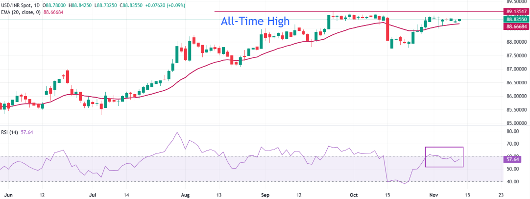 USD/INR在周四开盘时接近88.85。由于该货币对保持在20日指数移动平均线(EMA)上方,目前交易在88.66附近,其短期趋势仍然看涨。