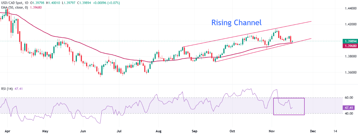 美元/加元调整至接近50天指数移动平均线(EMA),目前交易在1.3968附近。由于该货币对在上升通道内交易,总体趋势仍然看涨。