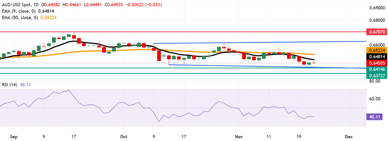 澳元兑美元周一在0.6450附近交易。日线图显示,该货币对在矩形范围内横向交易,反映出价格整理阶段。同时,价格继续低于九日指数移动平均线(EMA),表明短期动力疲弱。