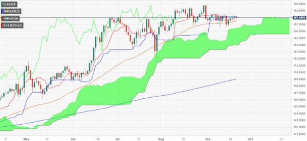 日线图显示该货币对正在横向交易,尽管创下了新的周高点 158.45,但未能守住 158.00 为回调打开了大门。在这种情况下,欧元/日元的第一个支撑位将是 Senkou Span A 的 157.89,其次是 Tenkan-Sen 的 157.61。预计一目均衡表 (Kumo) 顶部 156.50 会进一步下跌。
