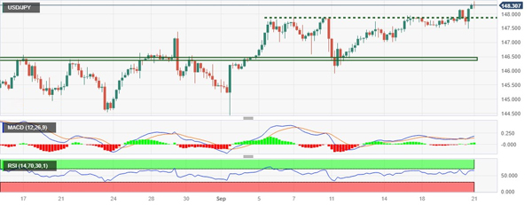 在近期突破 146.50-146.60 强水平关口的背景下,隔夜持续走强以及日收盘价高于 148.00 关口可能被视为看涨交易者的新触发因素。围绕美元(USD)的潜在看涨情绪以及美联储(Fed)鹰派前景的支撑,强化了美元/日元货币对的积极前景。