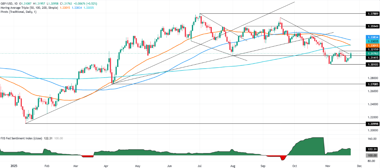 英镑/美元周二上涨约0.59%,因为在美国几乎没有经济数据的情况下,美元普遍走弱,投资者在等待英国秋季预算的发布。该货币对交易于1.3181,收盘于1.3200的心理位置。