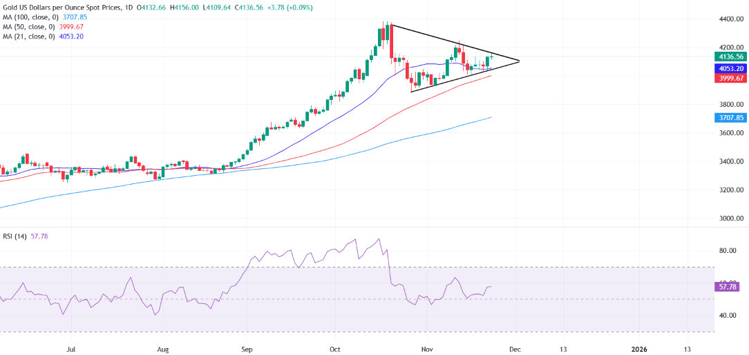另一方面,初步支撑位在4100美元附近,随后是4050美元附近的更强支撑区域,这里是三角形的下边线与21日简单移动平均线的交汇处。如果日收盘价低于该区域,将削弱结构,并使短期展望更倾向于调整。