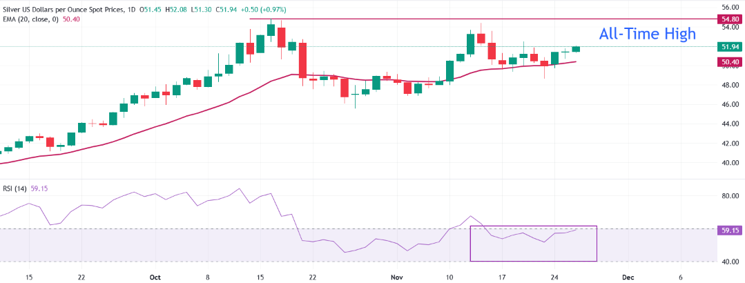 银价进一步上涨至接近52.00美元,因美联储鸽派预期令美国收益率承压。