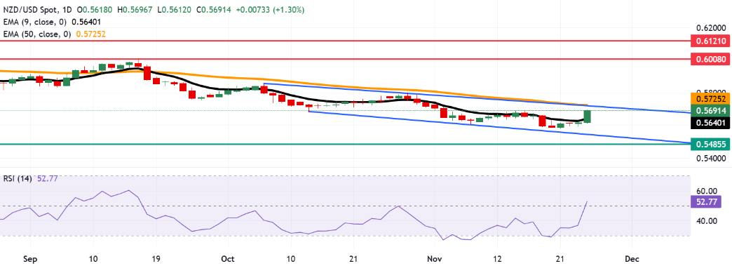 纽元/美元周三亚洲时段交易价格上涨超过1%,交易价格约为0.5690。日线图的技术分析显示,由于该货币对的价格仍然在下降通道内,存在持续的看跌趋势。