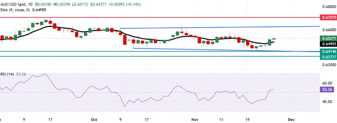 澳美货币对在周四交易于0.6530附近。日线图分析显示,该货币对维持在矩形整理区间内,表明中性偏见。该货币对已上破九日指数移动平均线(EMA),这表明短期上升势头已增强。