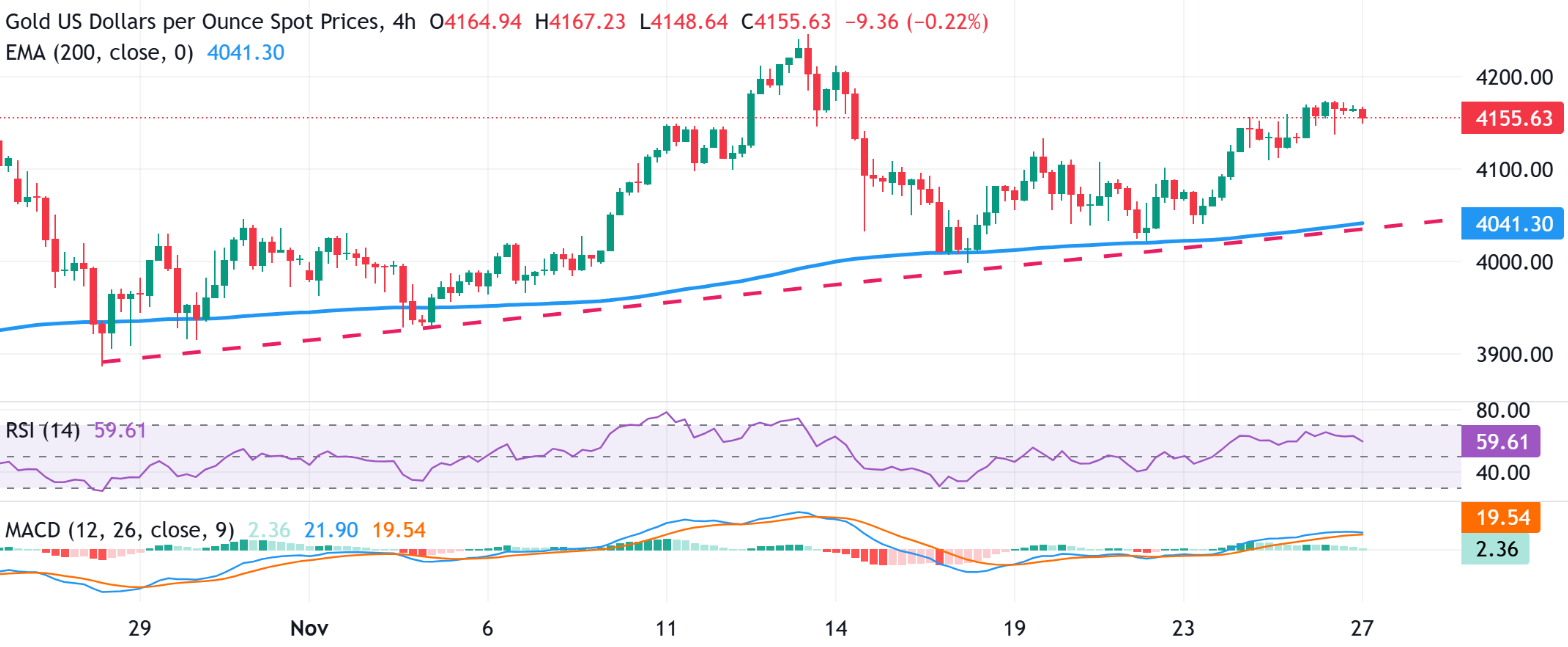 任何后续的跌势可能会在4132-4130美元区域找到不错的支撑,低于该水平,黄金价格可能会加速下跌至4100美元。一些跟风抛售可能会暴露出一个汇聚支撑,包括4小时图上的200期指数移动平均线(EMA)和从10月底延伸的上升趋势线,目前位于4040美元区域。有效突破后者可能会转变短期偏空,将XAU/USD拖至4000美元的心理水平。