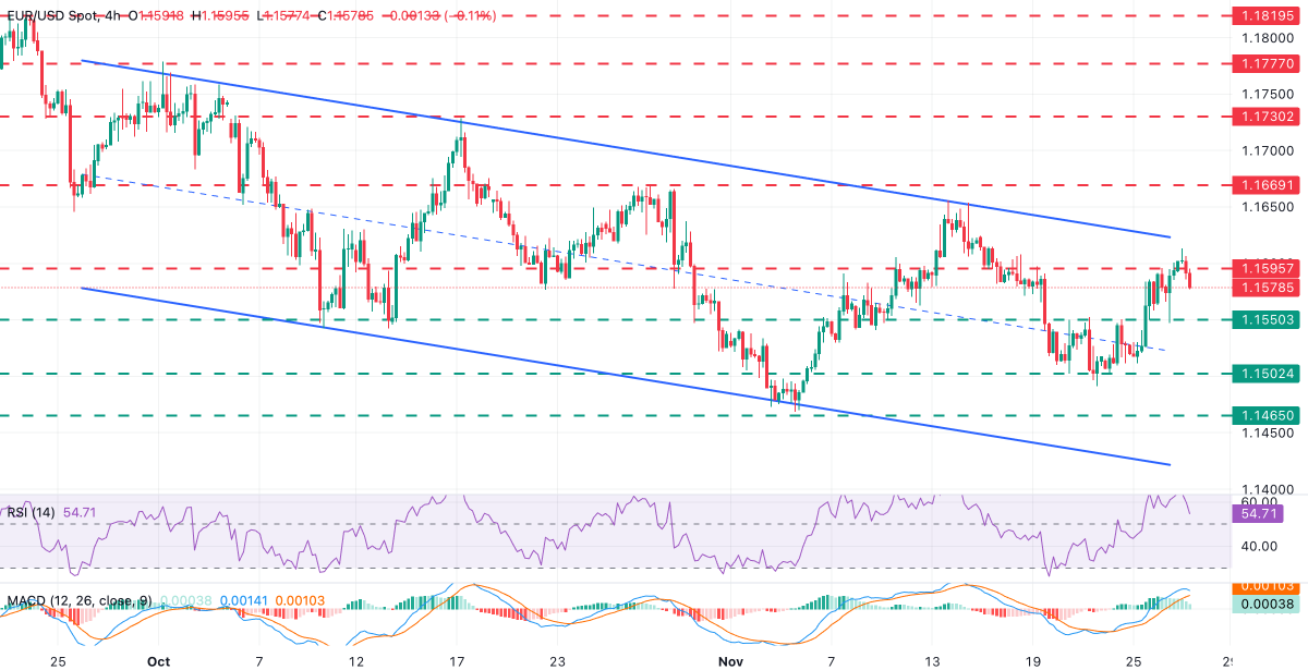 技术指标看涨,4小时相对强弱指数(RSI)在60附近波动,移动平均线收敛发散(MACD)持续在零线上方走高。然而,多头需要突破上述1.1620的阻力线,以确认趋势反转,并瞄准10月28日和29日的高点,接近1.1670,以及10月17日的高点,接近1.1730。