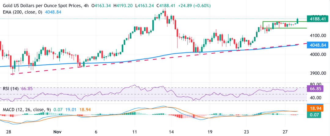 然而,在美国联邦储备系统(Fed)可能会在12月再次降息的日益普遍的预期下,任何有意义的美元升值似乎都难以实现。联邦储备系统 (Fed) 将在12月再次降息的预期,可能会成为无收益的黄金的顺风因素,使得在确认贵金属见顶之前等待一些跟进抛售是明智的。尽管如此,XAU/USD这对货币似乎准备登记每周收益,但多头需要等待突破4200美元的水平,然后再下注。