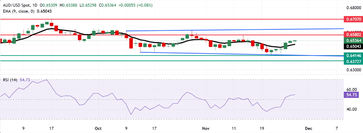 澳元兑美元在周五交易于0.6540附近。日线图的技术分析显示,该货币对在矩形整理区间内交易,反映出中性偏见。该货币对已上破九日指数移动平均线(EMA),表明短期看涨势头增强。
