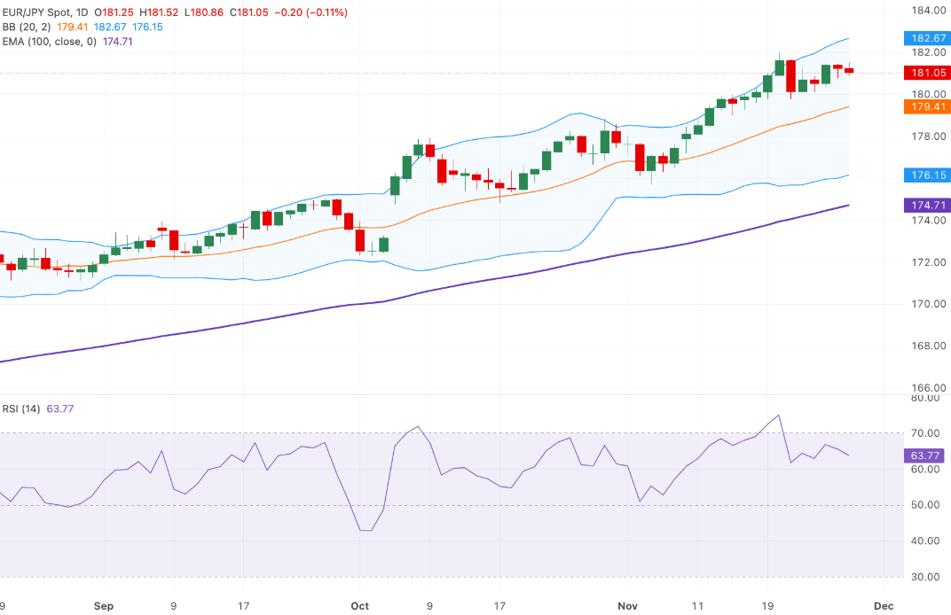 在日线图上,欧元/日元交易于181.04。价格保持在上升的100日移动平均线174.71上方,维持中期上涨趋势。平均线的斜度在过去几周内有所增加,强化了看涨控制。RSI为63.77,位置稳固但尚未超买,从65.56有所缓解,表明动量略有降温。
