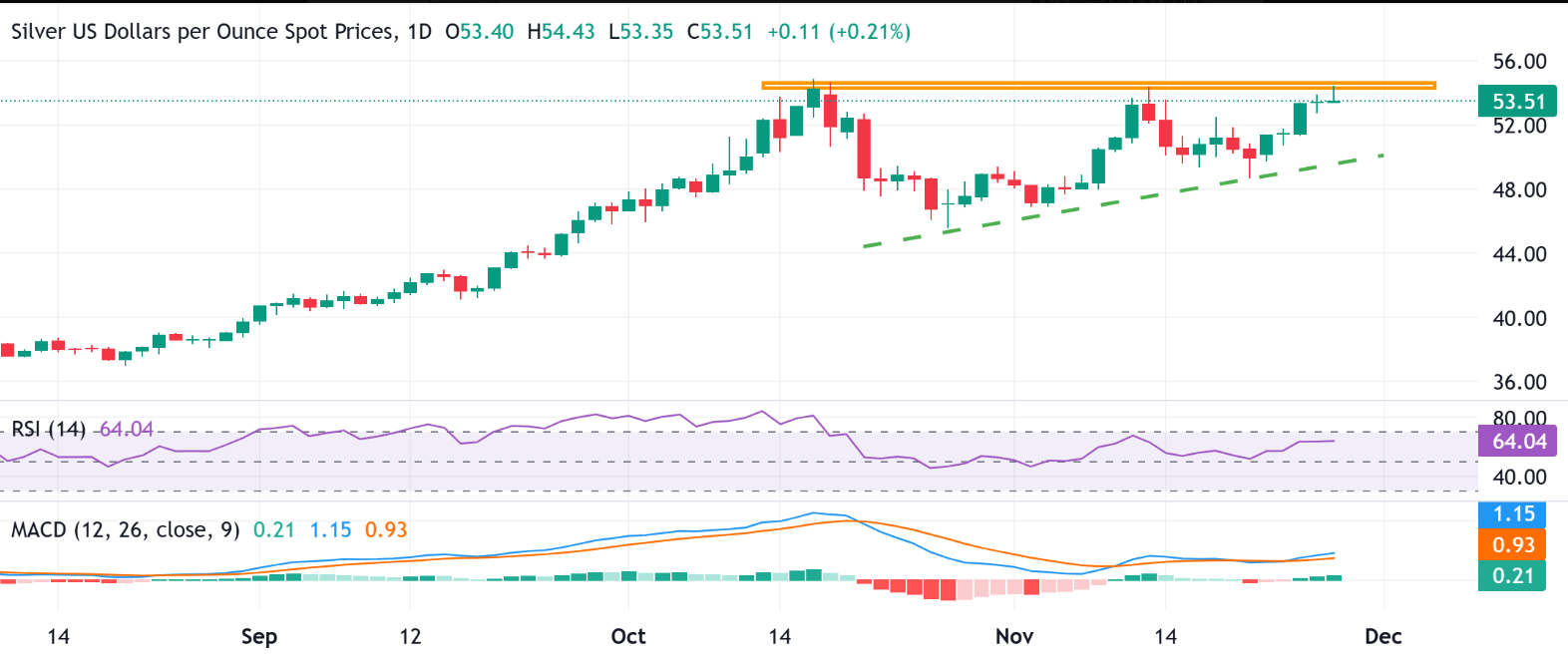 银 (XAG/USD) 在亚洲时段的上涨走势中难以获利,从$54.40-$54.45区域撤退,这是本周五早些时候触及的10月17日以来的最高水平。这种白色金属目前在$53.00中旬附近交易,仍比今日上涨0.20%,似乎有望录得强劲的每周涨幅。