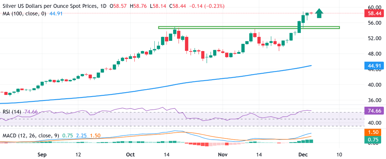 银价预测:白银/美元在$58.00s中值下方整理,接近历史最高水平