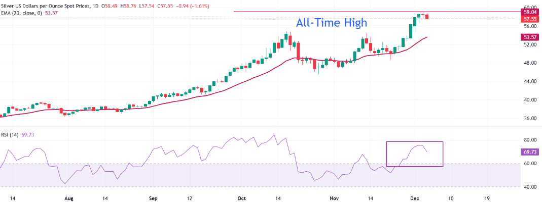 银价预测:白银/美元的上涨在59美元附近暂停,上方趋势依然完好。