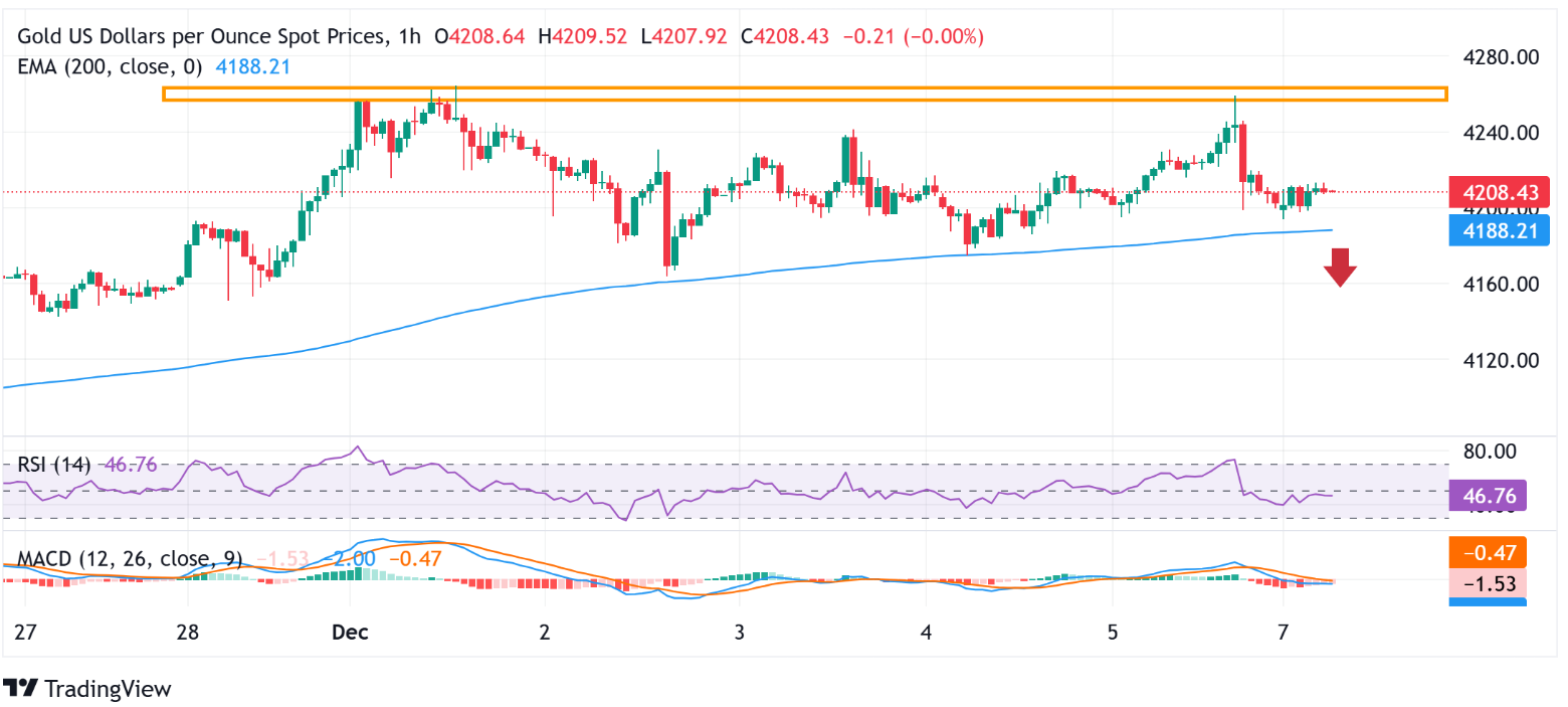 自本月初以来,200小时指数移动平均线(EMA)一直为XAU/USD提供了某种支撑。该支撑目前位于4190美元附近,应作为短期交易者的关键 pivotal点。如果有效突破该支撑位,可能会引发一些技术性卖盘,使黄金价格容易加速下跌至4164-4163美元区域,即月度波动低点,并进一步下跌至低于4100美元的水平。后者代表了从10月底延伸的短期上升趋势线,如果 decisively 被突破,将被视为熊市交易者的新的触发因素,并为更大的损失铺平道路。