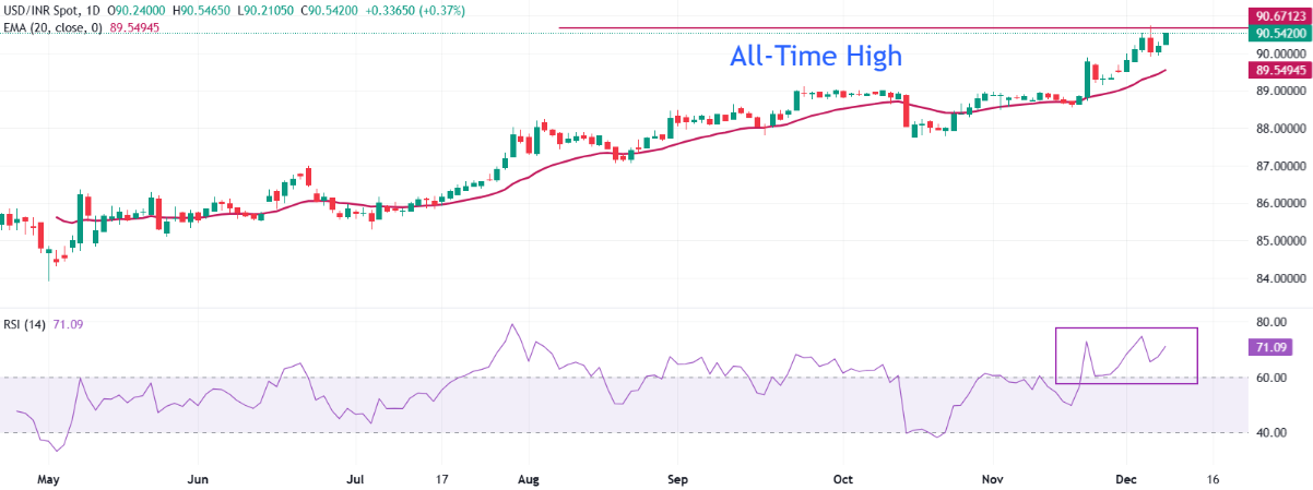 USD/INR 在撰写时交易于90.50。20天指数移动平均线(EMA)正在上升,且该货币对保持在其上方,强化了短期看涨趋势。