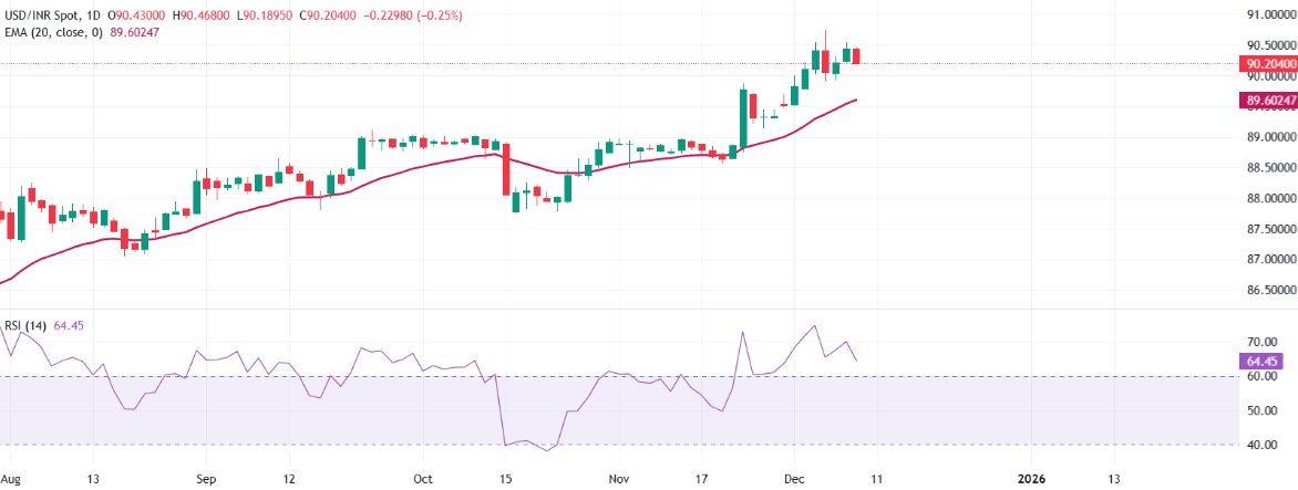 美元/印度卢比的汇率在写作时为90.3455。20天指数移动平均线(EMA)为89.6159,呈上升趋势,且该货币对保持在上方,维持看涨趋势。