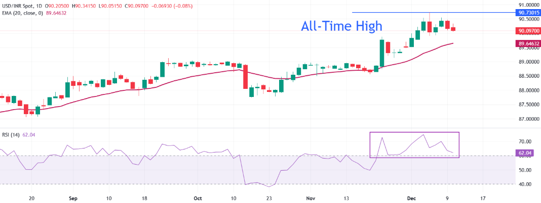 技术分析:美元/印度卢比跌至接近90.00。