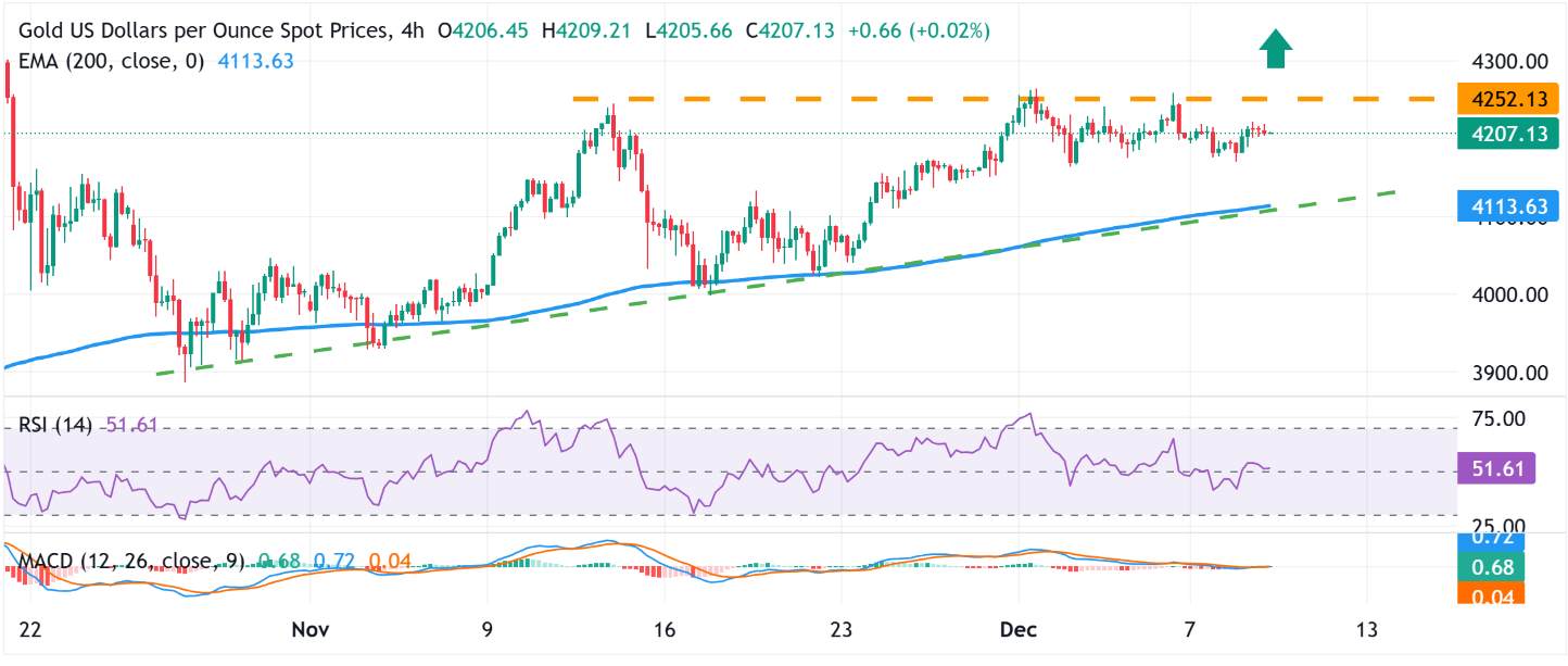 在过去的两周左右,XAU/USD对在熟悉的区间内振荡。此外,从交易区间的支撑附近出现的夜间反弹以及随后的上涨对看涨交易员有利。然而,日线图上的中性振荡器使得在$4,245-4,250阻力区域上方持续走强之前审慎地等待是明智的,然后再进行进一步的头寸调整。然后,动量可能会将黄金价格推至$4,277-4,278的中期障碍,进而迈向$4,300的目标。