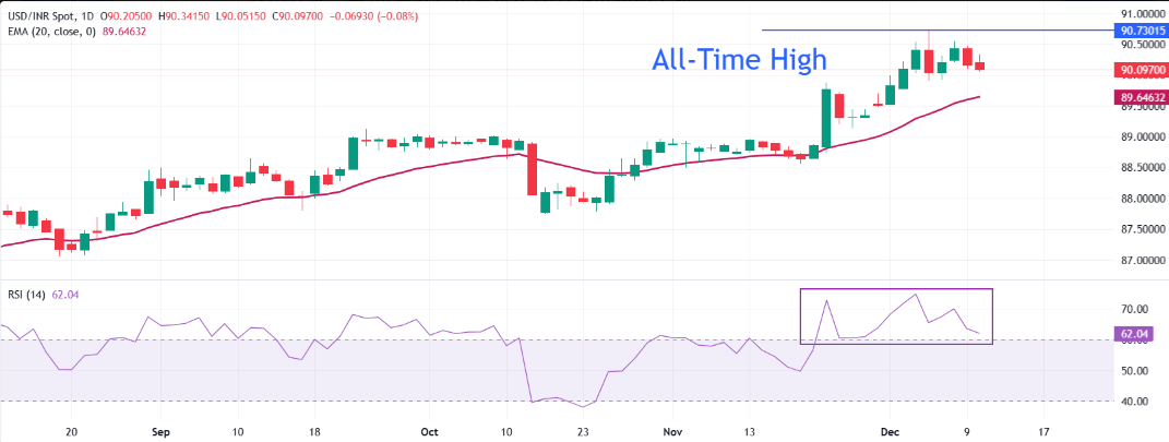周三在开盘时段,USD/INR 交易接近 90.00。 上行的 20 日指数移动平均线 (EMA) 位于 89.6463,表明趋势稳定向上,现货价格高于该水平。