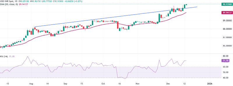周一美元/印度卢比交易价格在90.94附近走高。20-指数移动平均线(EMA)在89.9414上升,价格保持在上方,短期趋势指向更高。从88.64开始的上升趋势线支撑了看涨倾向。