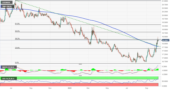 美元/墨西哥比索货币对在新一周的第一天重新获得了一些积极的牵引力,并扭转了周五从 18.0000 附近(即 3 月 24 日以来的最高水平)回撤的部分走势。利用超越 7 月份大幅下跌的 38.2%斐波那契回撤位的上涨机会,目前交易在 18.2475 区域附近,当天仍上涨超过 0.35%。