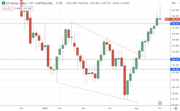在连续十一周上涨之后,美元指数终于在上周末收盘走低,但跌幅非常小。每周烛台是看跌 pin bar。这些因素可能表明,虽然长期趋势仍然看涨,但我们即将看到更深的回调。尽管债券收益率相对较高,但市场开始重新建立一定的风险偏好可能会支撑这一点。