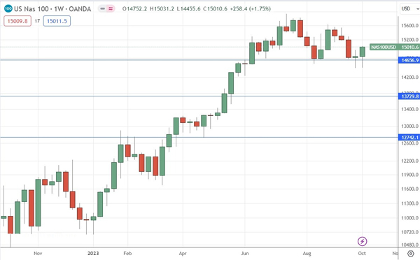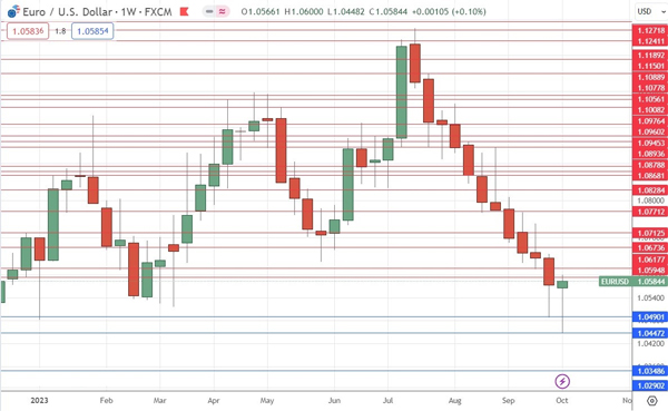 欧元/美元货币对上周初一度触及数月新低,低于 1.0500 美元的大整数,然后大幅反弹。下面价格图表中显示的每周烛台是看涨的 pin bar,表明我们现在可能会看到针对长期看跌趋势的更深的看涨回撤。