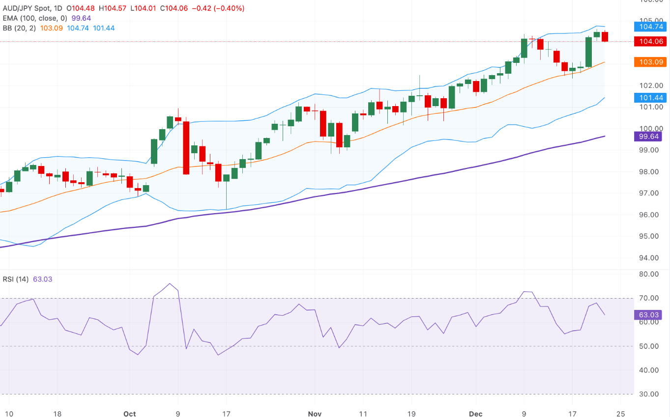 在日线图上,澳元兑日元交易于104.06。价格保持在上升的100日指数移动平均线(EMA)99.64上方,强化了广泛的上涨趋势。平均线已经连续数周缓慢上行,保持了看涨的倾向。RSI(相对强弱指数)为63.03,保持在中性50水平之上,尽管动力较之前的超买读数有所冷却,但仍提供支持。价格位于103.09的布林线中轨上方,并且随着布林线收窄,价格倾向于靠近上轨104.74,这表明波动性有所减少。收盘价突破上轨可能为的心理水平105.00铺平道路。