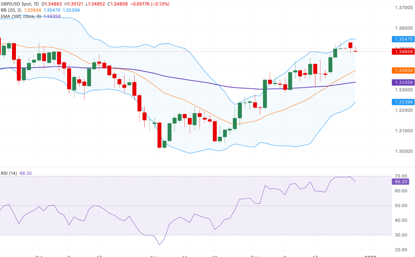 在日线图上,英镑/美元交易于1.3486。100日指数移动平均线(EMA)略有上升,价格保持在其上方,维持了中期的上涨趋势。回撤会在这一平均线处遇到动态支撑,保持了广泛的上涨趋势。相对强弱指标(RSI)位于66(看涨),从近期高点有所回落,显示出强劲的势头,没有超买信号。初步支撑位在布林线中轨1.3393,100日EMA位于其下方的1.3336。保持在这一区域之上将限制下跌,并有利于上涨。