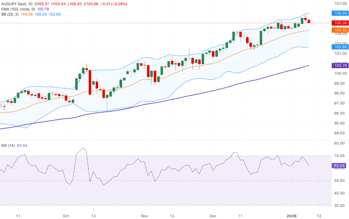 在日线图上,澳元/日元保持在上升的100日指数移动平均线(100.79)和20日简单移动平均线(104.35)之上,维持看涨趋势。两者的上升斜率支持继续上涨,回踩时可能在这些水平找到买家。RSI(相对强弱指数)为62.04,处于中性至看涨区间,确认了持续的上涨动力,没有出现超买迹象。
