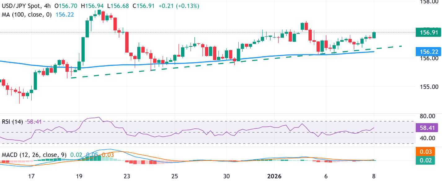 4小时图上的100期简单移动平均线(SMA)略有上升,表明美元/日元汇率上方有强劲的看涨趋势。目前100期SMA位于156.22,提供附近动态支撑。移动平均线收敛发散(MACD)指标中,MACD线在接近零的水平上上穿信号线,出现看涨交叉,同时柱状图呈温和正值,表明动量有所改善。相对强弱指数(RSI)为58,高于50中线,进一步支持温和的看涨气氛。